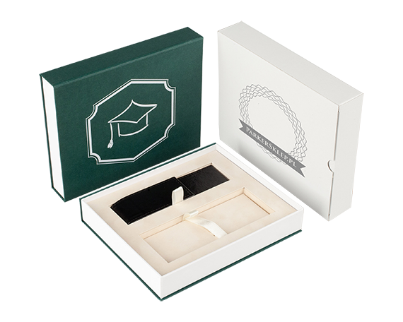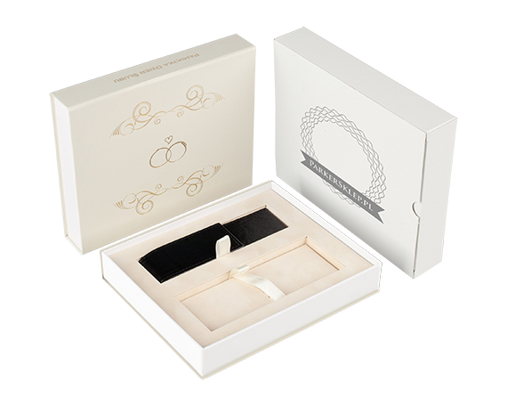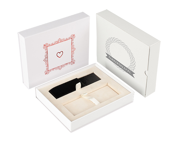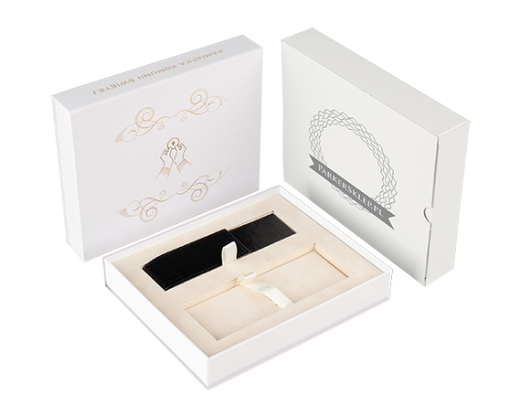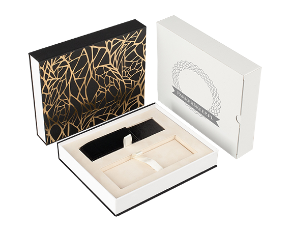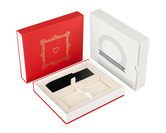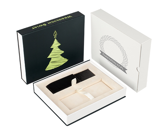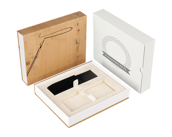Classy box in any colour, made of noble material, e.g.: wood-like paper, material made of flax, embossed material. Available finishing: gilding, UV varnish, 3D varnish. The box is lined inside with soft satin fabric and hides a black magnet-locked case. The kit is designed for two Parker products.